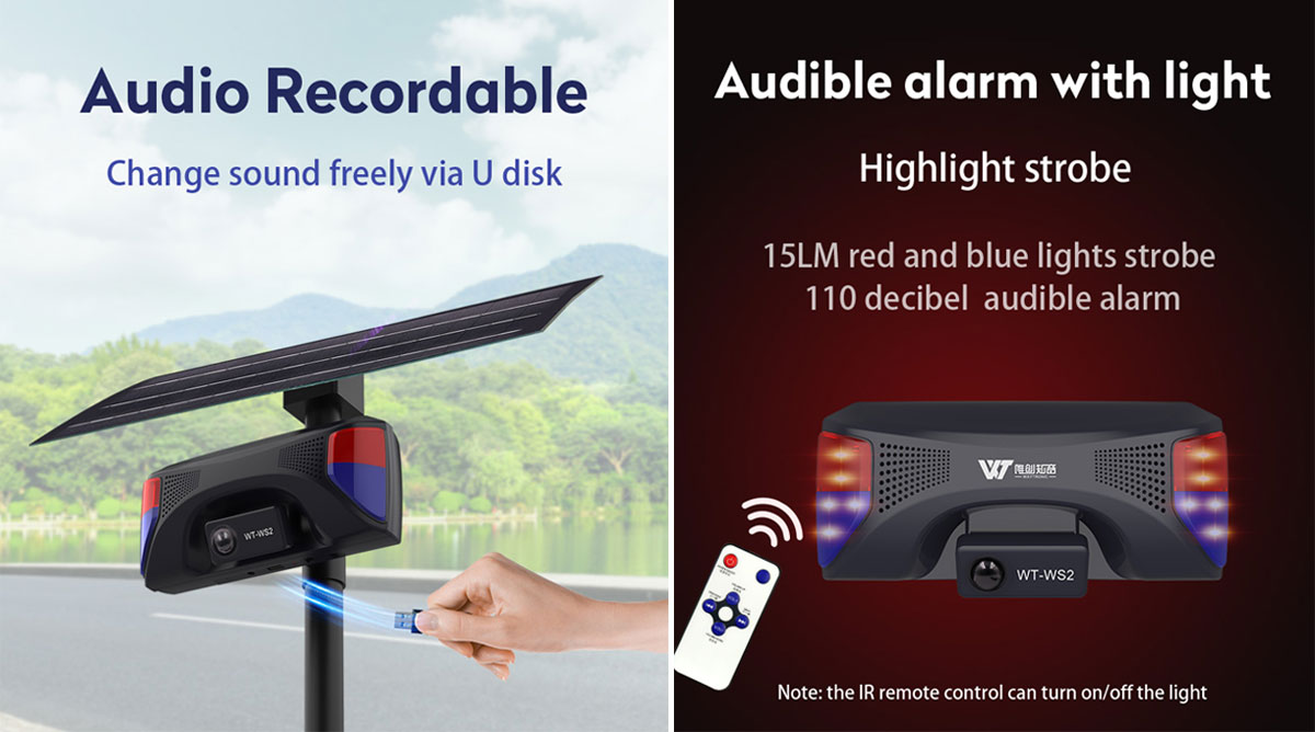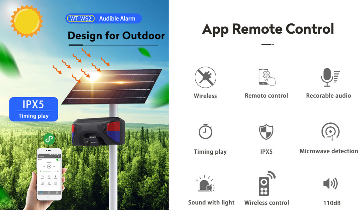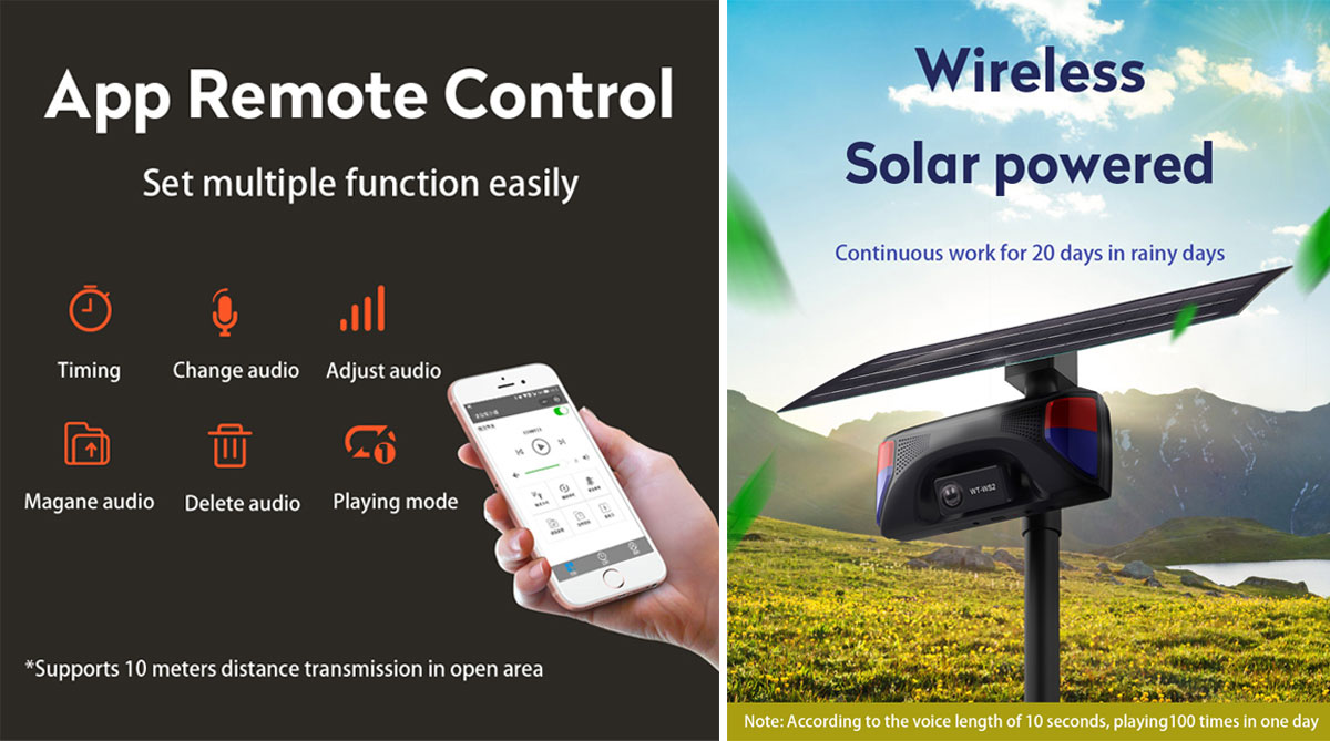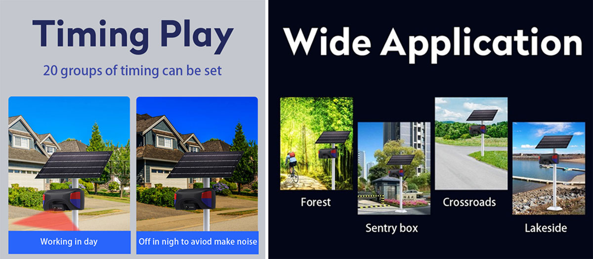 Welcome to use Wei Chuang Zhiyin electronic products. This product adopts infrared pyroelectric + microwave induction technology. When a person passes through the range of the induction zone, it will immediately trigger the voice playback and synchronously flash the warning lights. The product has infrared remote control and WeChat applet functions, which can perform sound adjustment, song selection, timing and other functions.