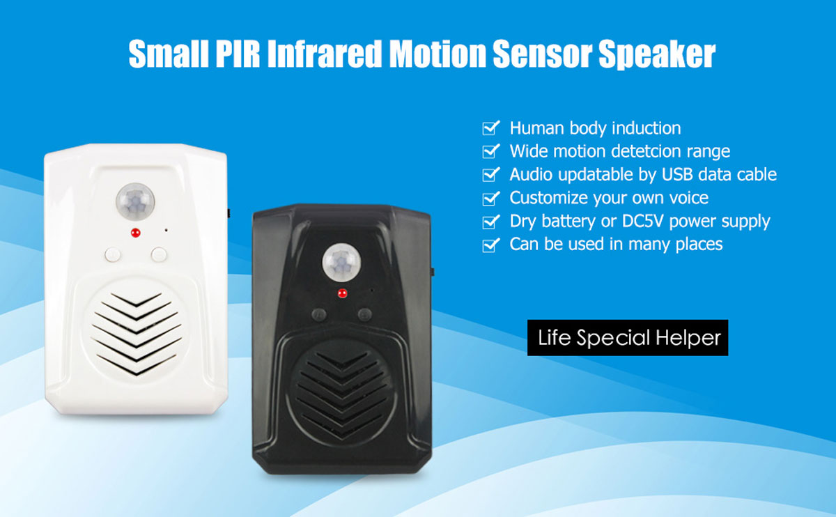 Wireless PIR Motion Sensing prompter has 4 meters detection range. PIR Motion Sensing prompter,When someone enters the detection range, it will play audio. The audio files can be replaced by yourself. Connect to computer by USB data cable, then copy new audio files(MP3 only) to the player. Your MP3 files will playback automatically after the PIR sensor has been activated.