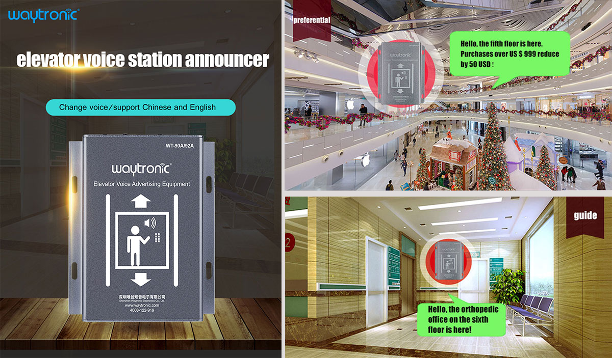 This is a voice announcer for elevator. Adopt high-performance single chip and professional voice chip. Support MP3 audio format, adopt the altitude sensor, easy to installation and can detect the working condition of the elevator then play the voice. You can freely replace voice files via U disk. It has been widely used in elevator floor announcement, floor voice navigation, sightseeing elevator/ cable car specific scenic spots, public security warning and other occasions.